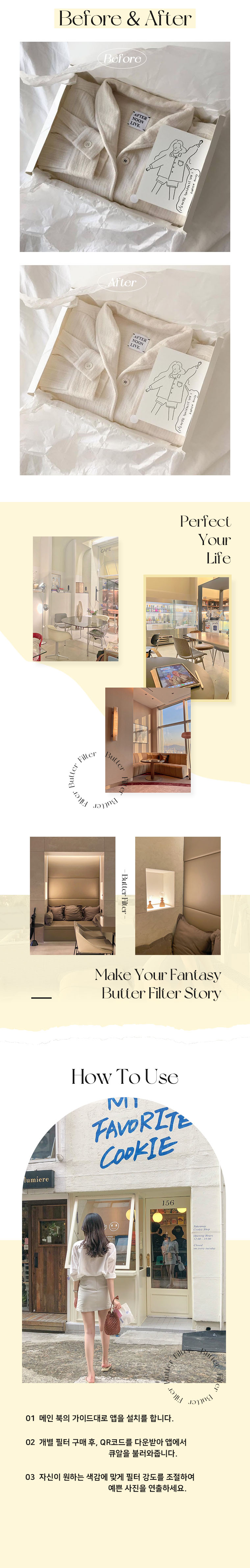 육아 하면서 인스타에 아기 사진 여러장 찍어 올리곤 하는데 둘러보면 너무 예쁘게 올리는 사람들이 많더라구요 늘 어떻게 저런 감성으로 찍는지 궁금해 하던 찰나에 버터 필터 광고를 보게됐고 유료라 망설여지다 단품 구매는 저렴하길래 필터 단품으로 두개를 구입했어요!